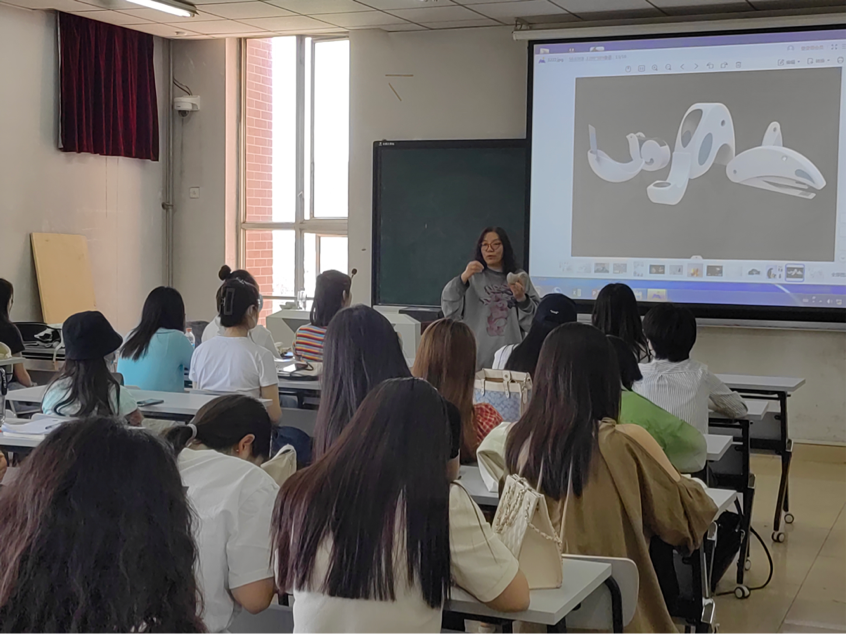 会上,王朝侠老师向同学们讲述如何抓取自然形态触动人心灵的点,结合成功的产品案例,鼓励同学们多观察、勤思考,寻找能够感动自己的内心同时又能体现自然形态的关键点,并通过点、线、面的方式呈现,在不断的体会与修改中,以做出打动人心的灵动设计。同时,王老师向同学们展示了设计过程中的优秀线稿、渲染图、产品效果图,为同学们讲述如何能够表达出科技发展下简洁的设计语言,在细节中寻求形态的变化。在现场展示了自制的不同自然形态石膏体,通过近距离展示和互动,同学们更加直观地了解到不同曲线的转折,体会到形态的变化,掌握了创新设计的方法。
